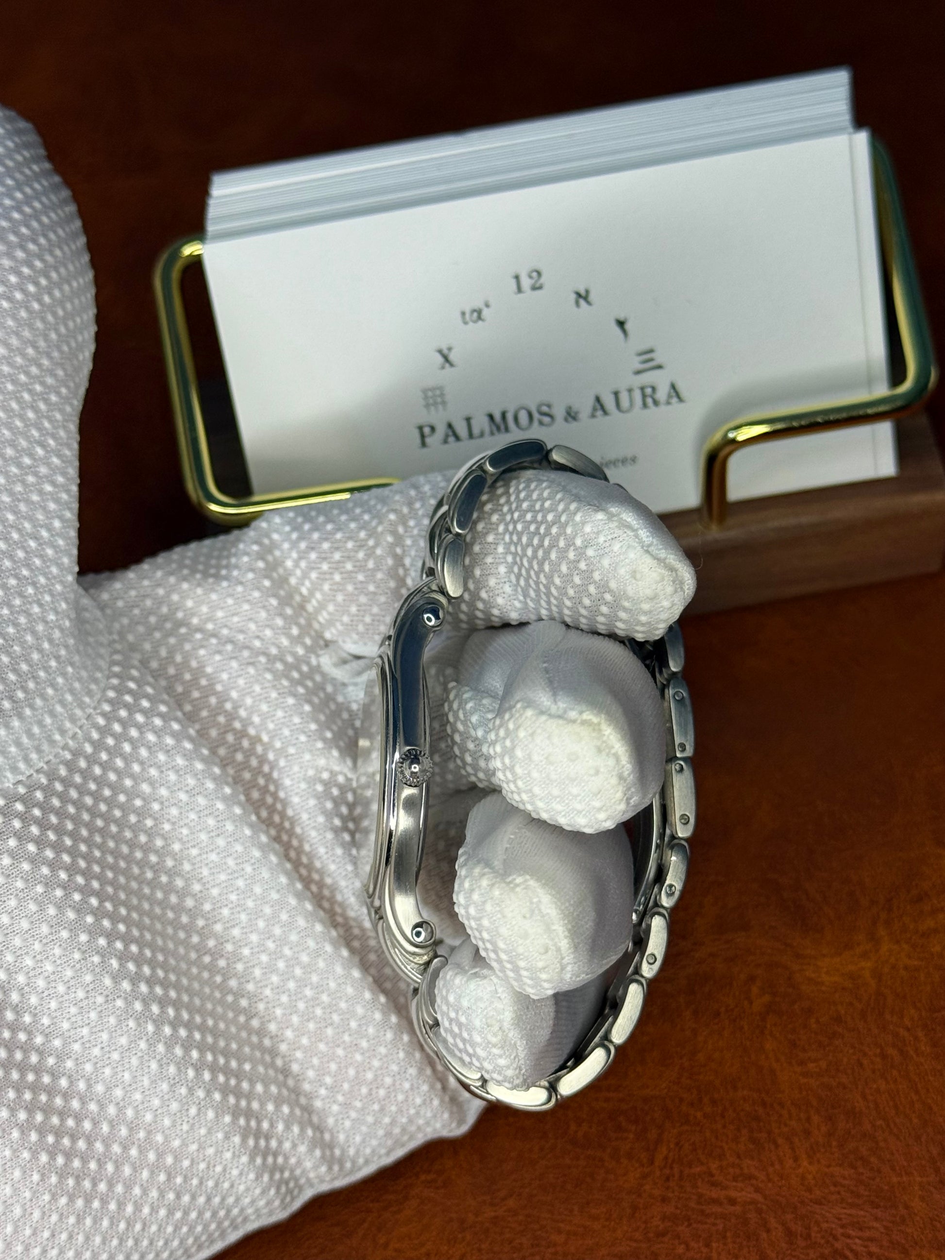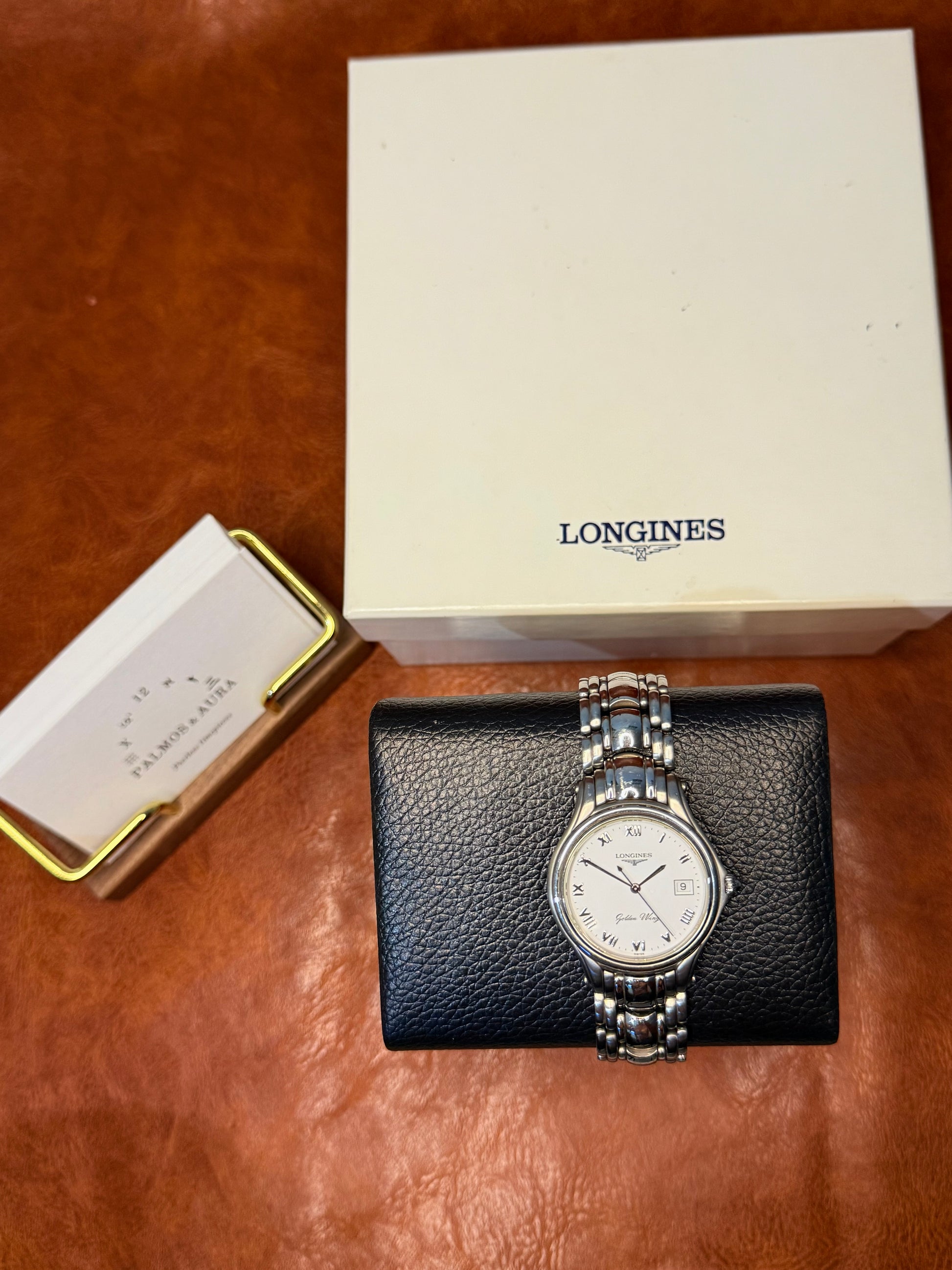 The Longines Golden Wing is a tasteful, polished quartz collection from the 1990s, combining refined aesthetics, sapphire crystal protection, and reliable Swiss quartz accuracy. Introduced around 1992 as part of Longines’s high-end quartz and chronograph lineup, this model features a sapphire crystal, 30–100m water resistance, a Roman numeral dial, and a slim 34mm case. The case back is engraved with a five-star logo and Longines’s iconic winged hourglass emblem. It comes on a stainless steel bracelet. Some wear is visible on the original watch box, but the watch itself remains in New Old Stock condition.