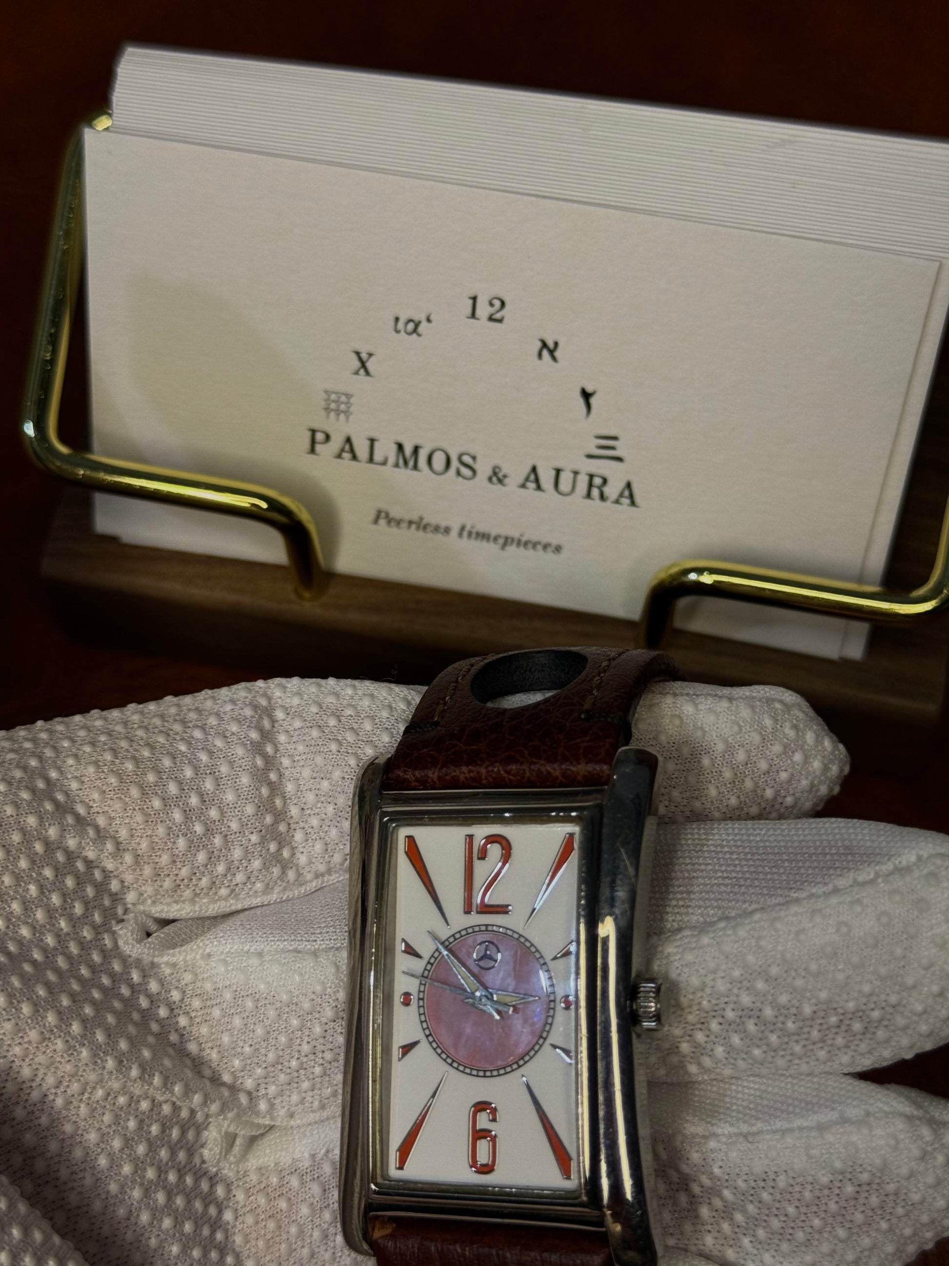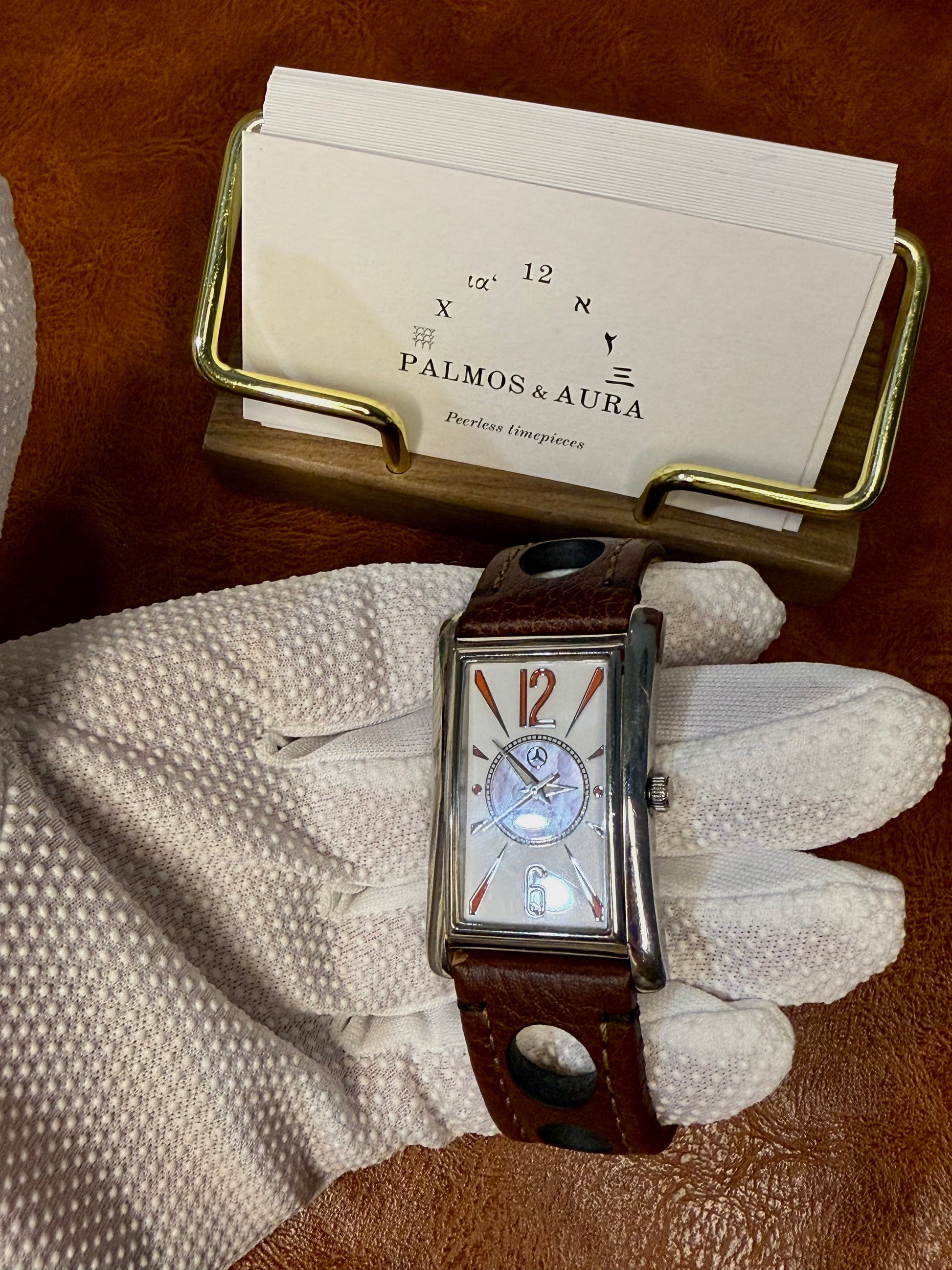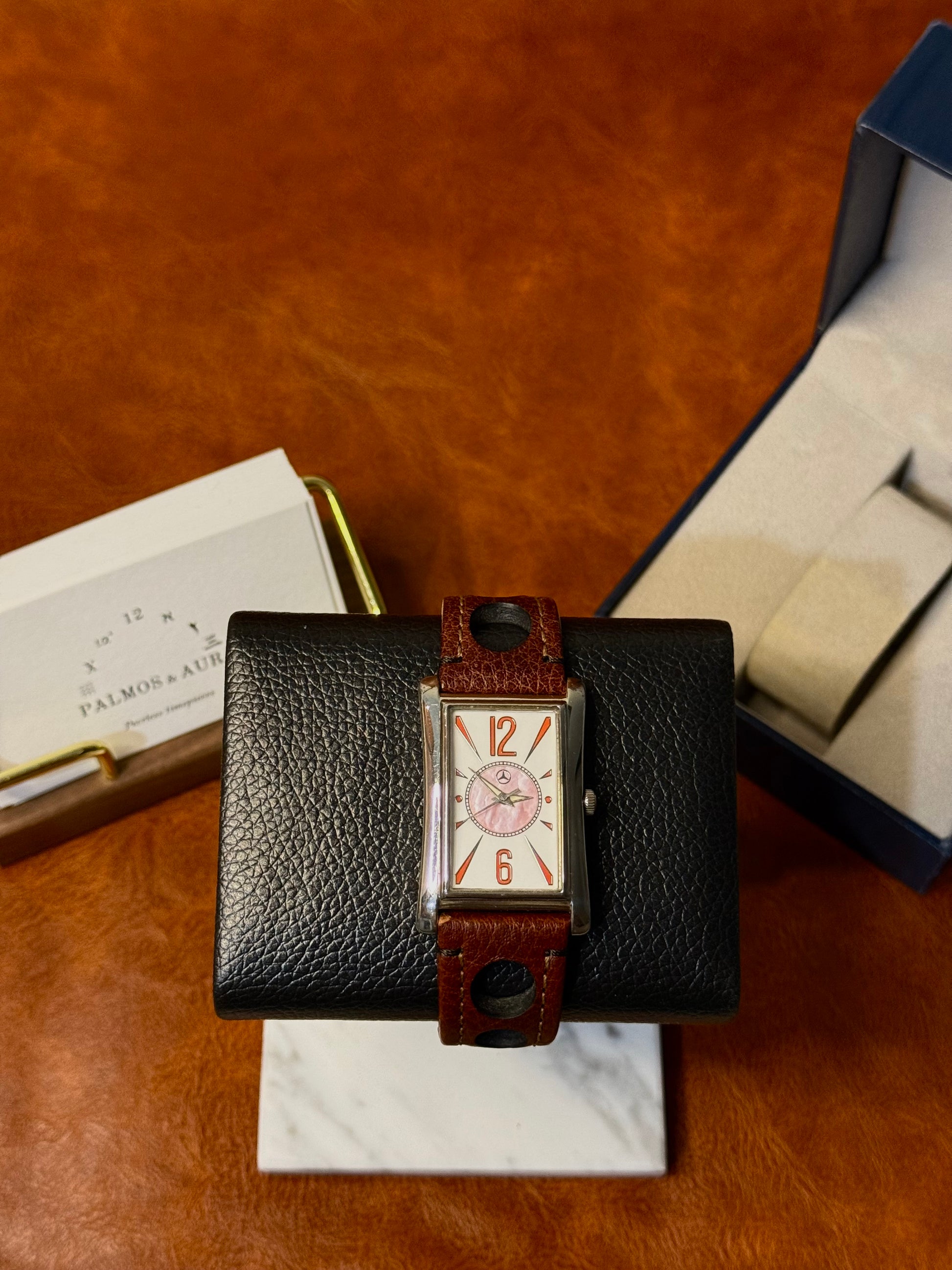 We always knew Mercedes-Benz was a great automotive manufacturer — but our perception changed when we came across this beautiful Mercedes-Benz timepiece, featuring a mother-of-pearl dial paired with a perfectly matched racing-style Hirsch leather strap. Whether you’re a Mercedes-Benz owner or simply a fan of refined design, this rare collectible watch is looking for its new home.