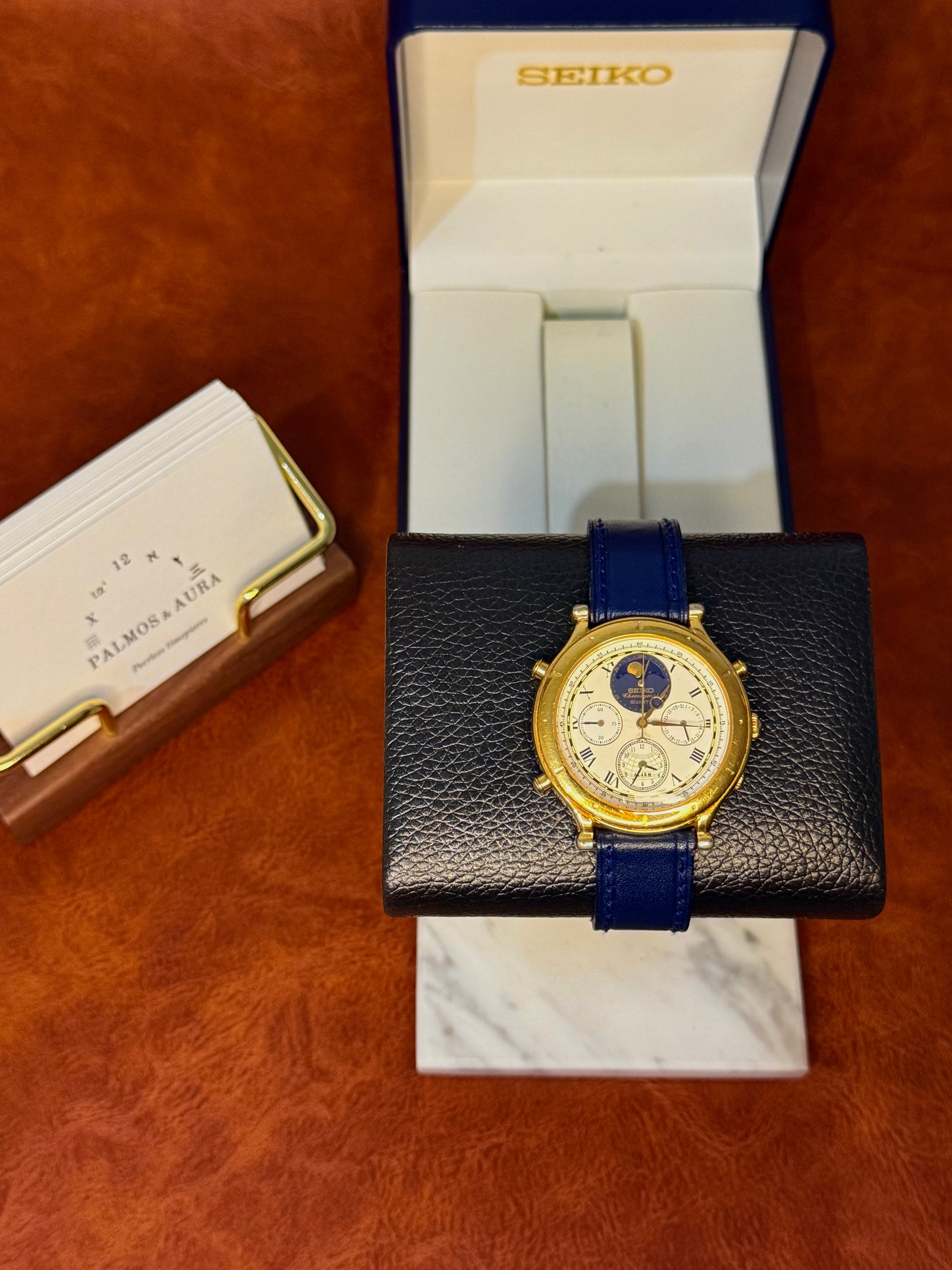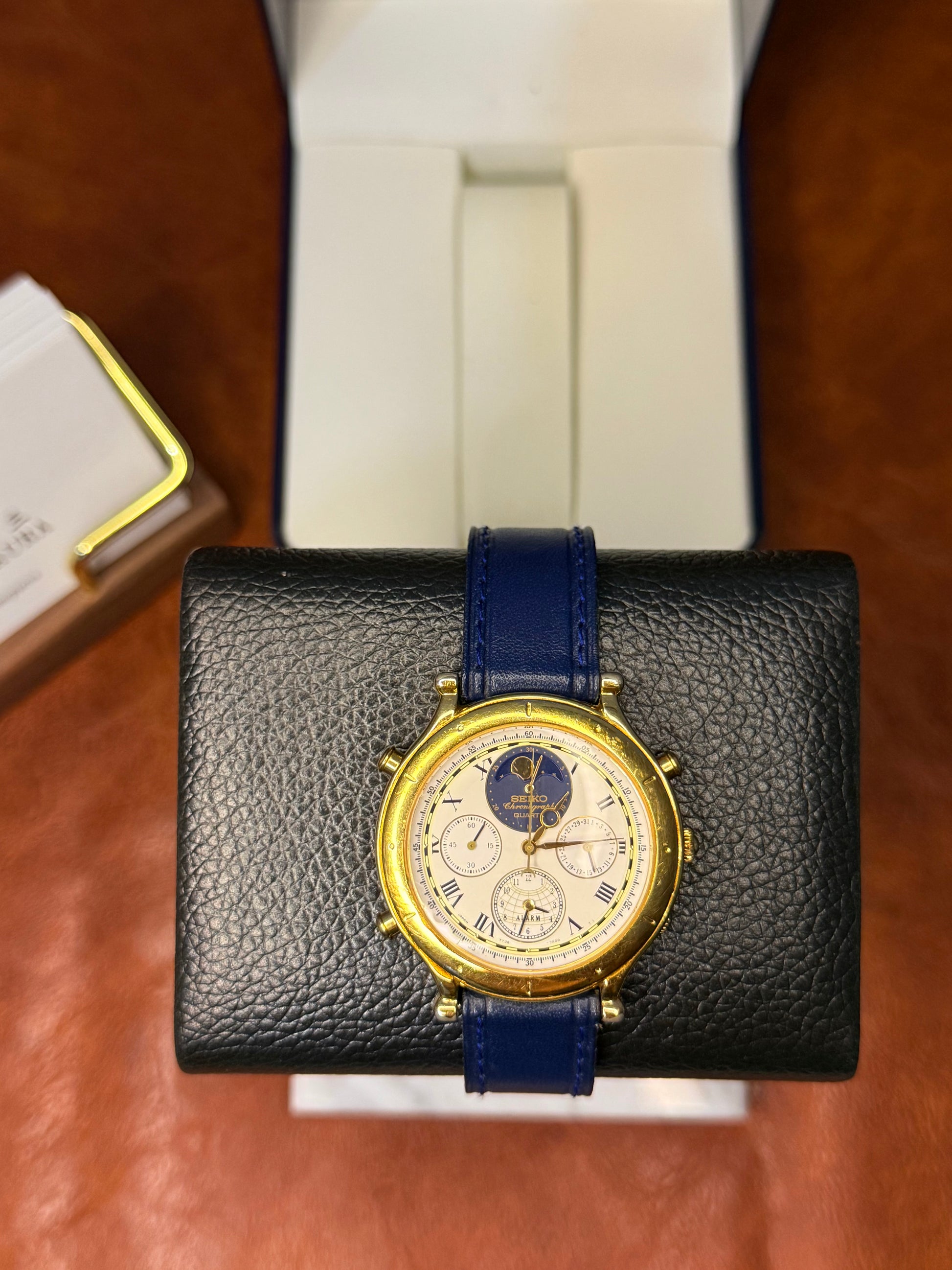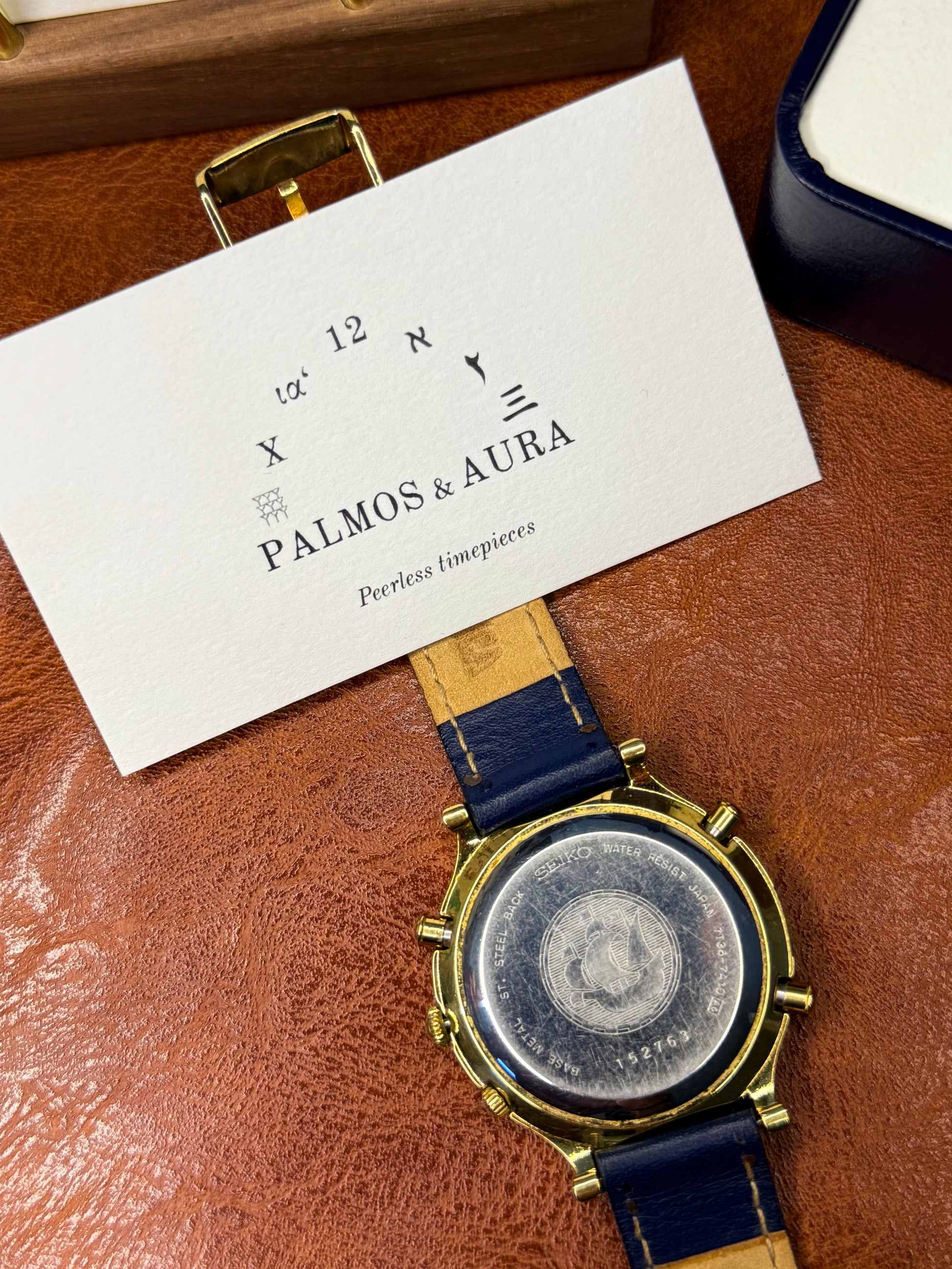 The Seiko “Age of Discovery” series is a captivating vintage watch line from the early 1990s, thoughtfully designed to celebrate the 500th anniversary of Christopher Columbus’s 1492 voyage. This vintage Seiko Age of Discovery features an alarm, moonphase, and chronograph. It is powered by the 7T36-7A20 movement and was produced in May 1991. The watch is in excellent condition considering its age and is now looking for its next owner.