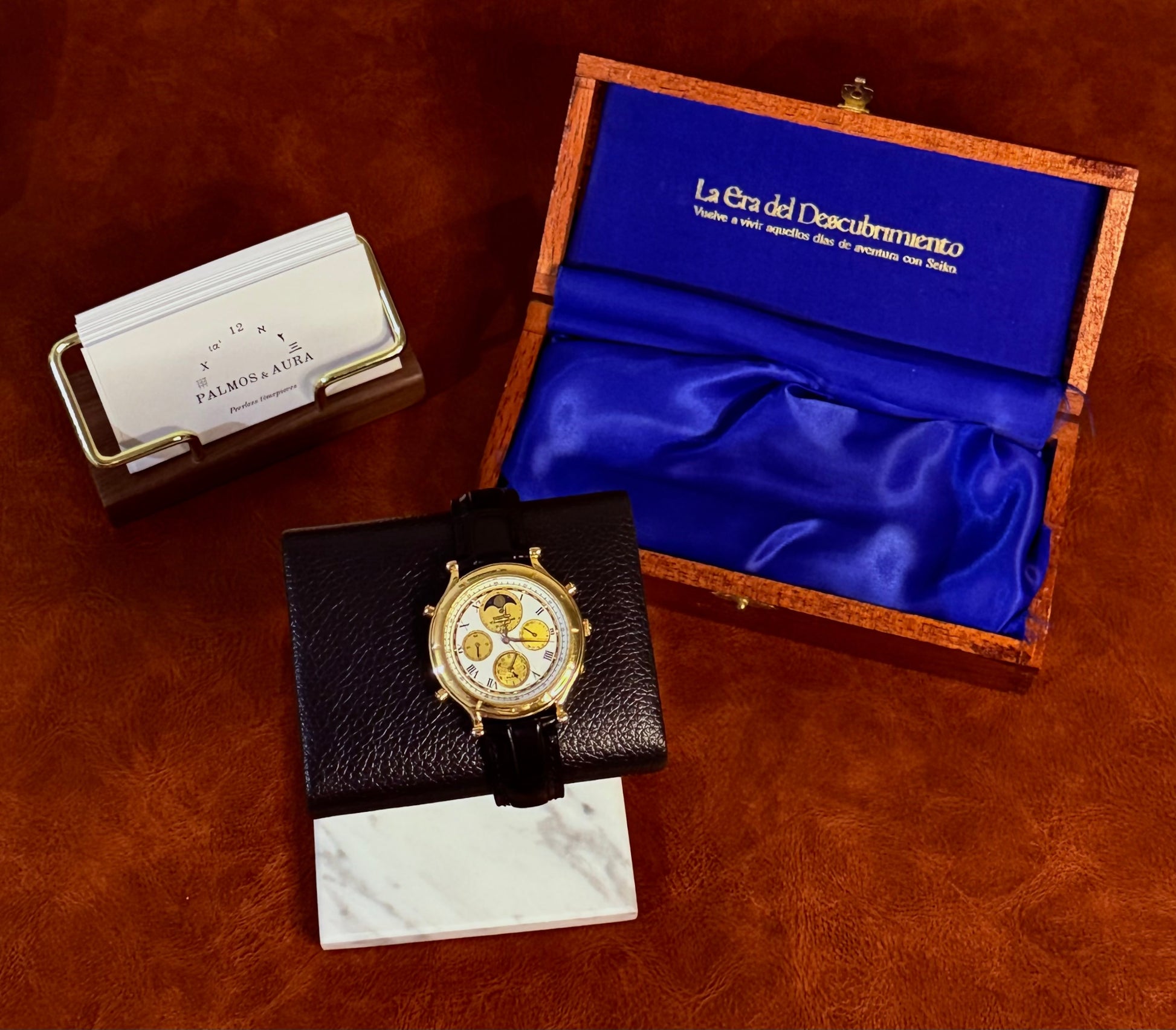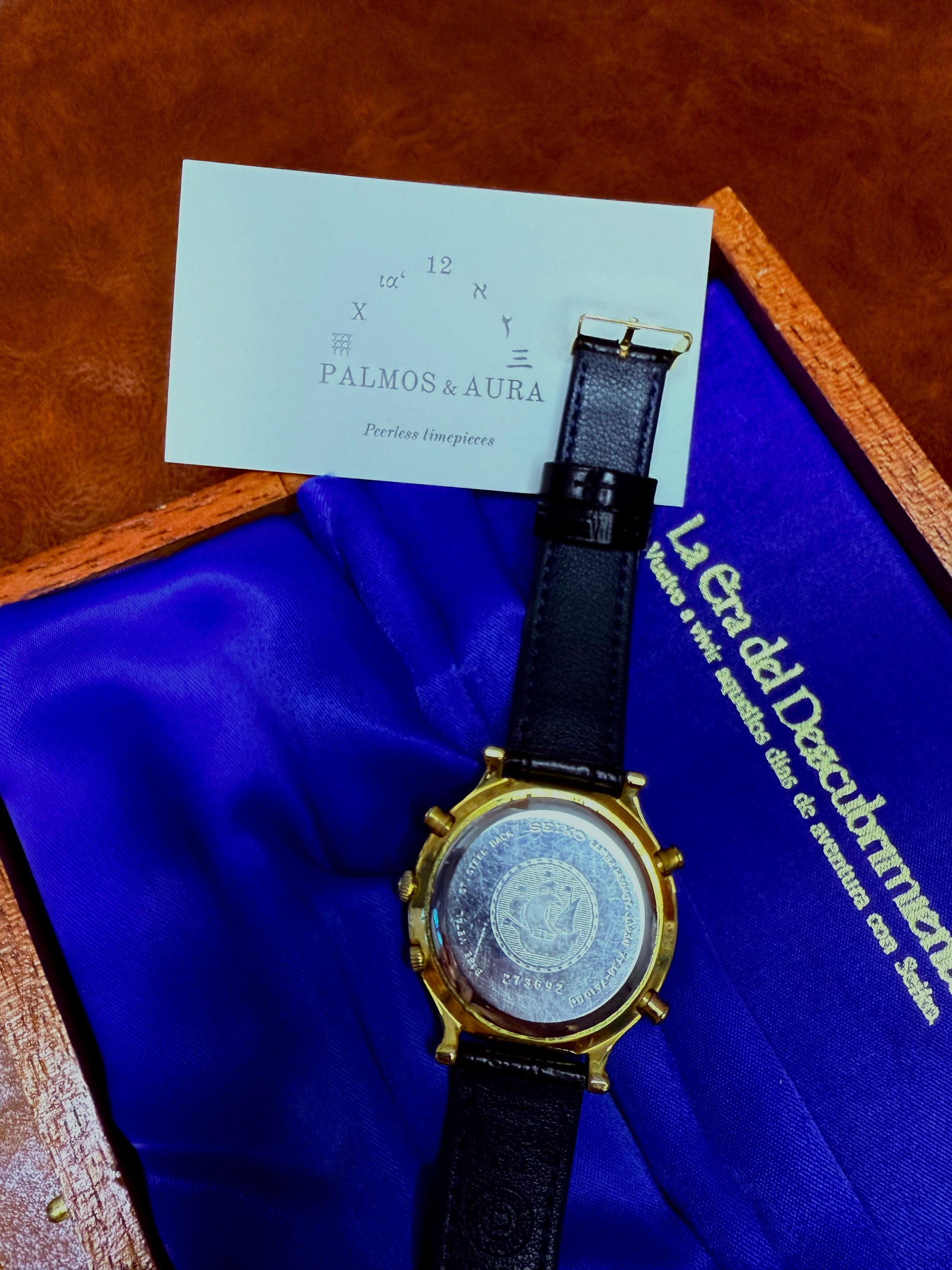 The Seiko “Age of Discovery” series is a captivating vintage watch line from the early 1990s, thoughtfully designed to commemorate the 500th anniversary of Christopher Columbus’s 1492 voyage. This particular model features an alarm, moonphase, and chronograph. It is powered by the 7T36-7A20 movement and was produced in May 1991. The watch is in excellent condition for its age, and it’s looking for its next owner. It comes with the original box (no papers) and a brand new leather strap.