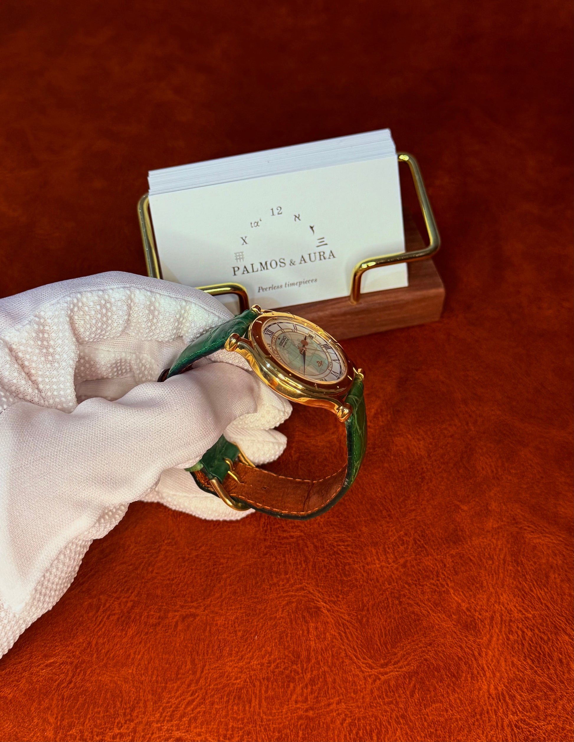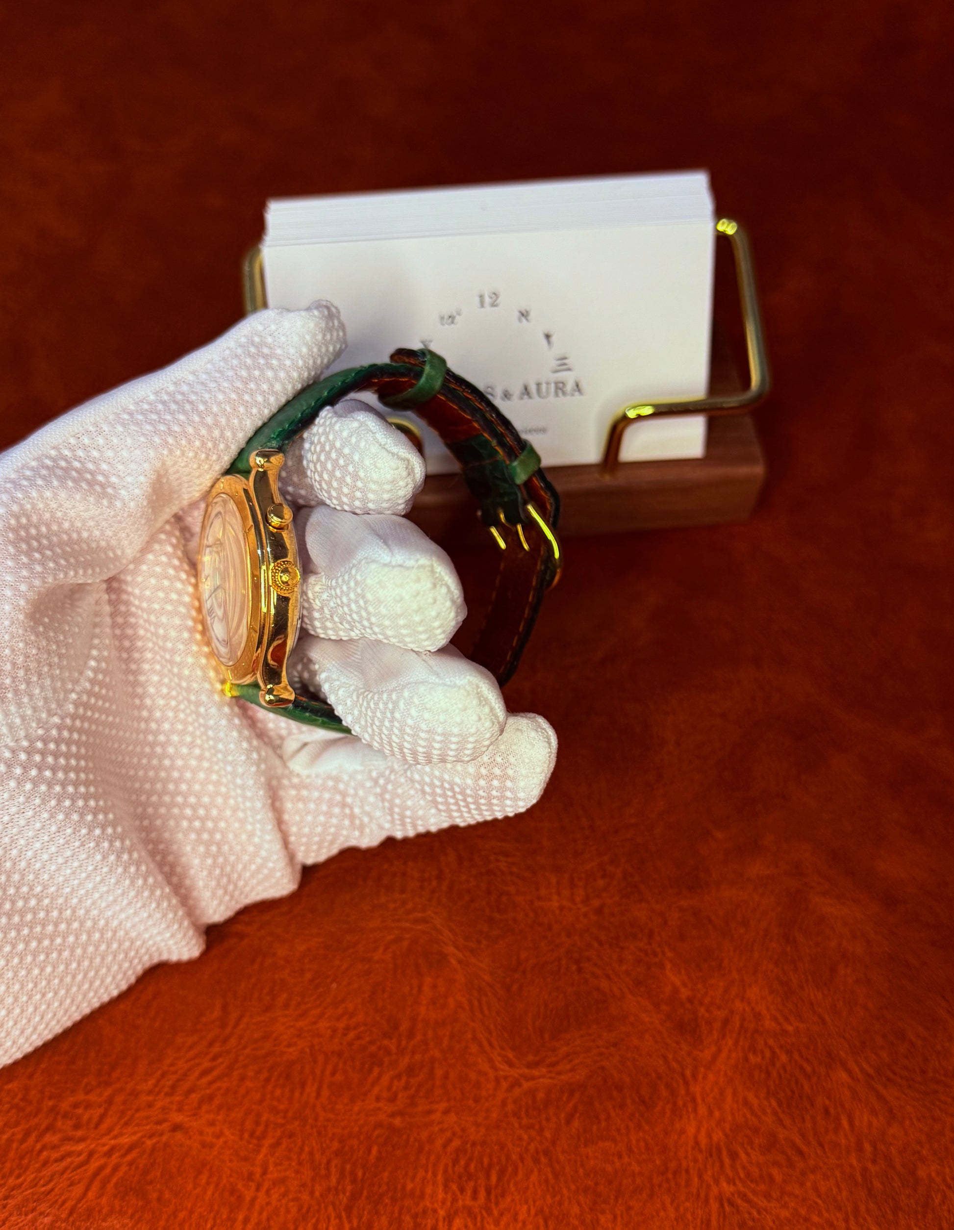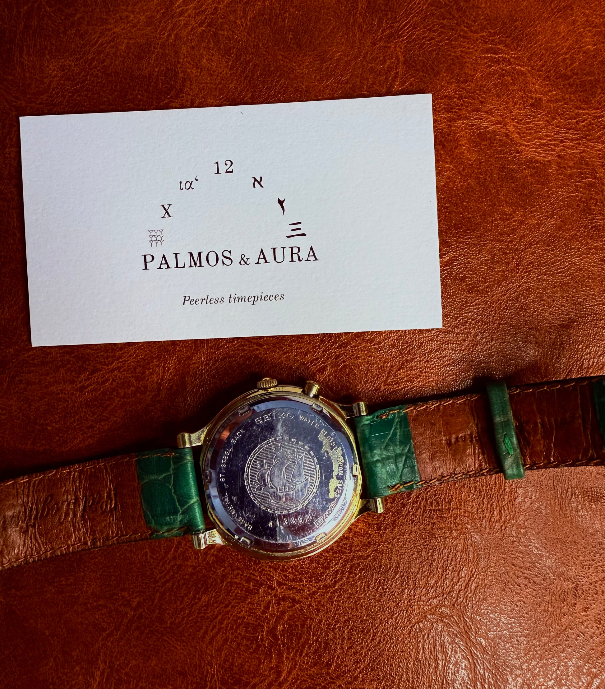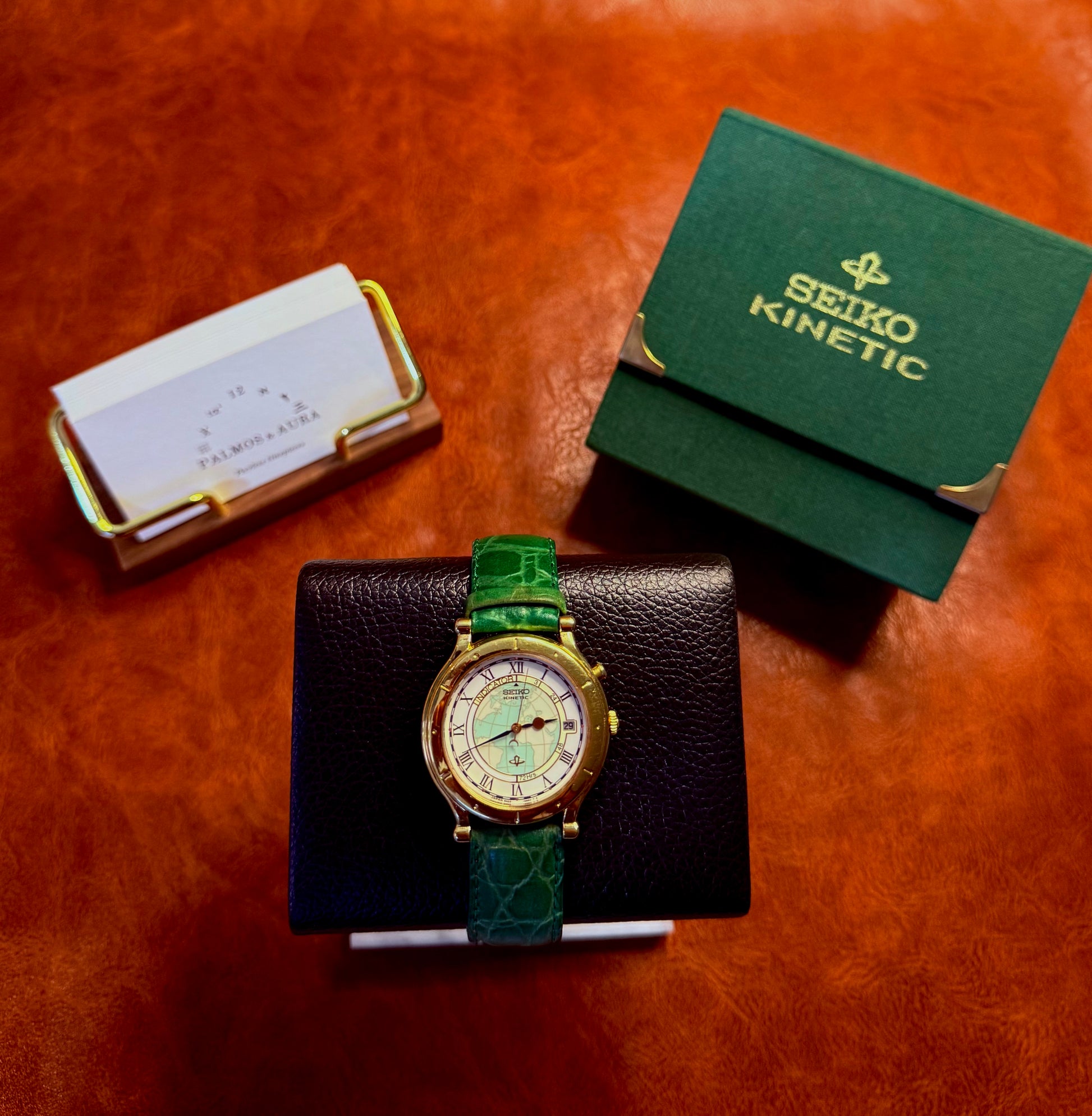 The Seiko “Age of Discovery” series is a captivating vintage watch line from the early 1990s, thoughtfully designed to celebrate the 500th anniversary of Christopher Columbus’s 1492 voyage. This Seiko Age of Discovery vintage kinetic 5M22-6B00 features a kinetic movement which recharges the battery with wrist’s movement. Kinetic comes from Ancient Greek word ‘kinesis’ which means to move. Seiko Kinetic is one of Seiko’s most important and innovative contributions to the watch world. It combines the accuracy of quartz with the self-charging capability of automatic watches, creating a hybrid technology that was groundbreaking at the time of its release. Seiko Kinetic watches use a rotor (like in automatic watches) to generate electricity, which is then stored in a rechargeable battery or capacitor to power a quartz movement.
