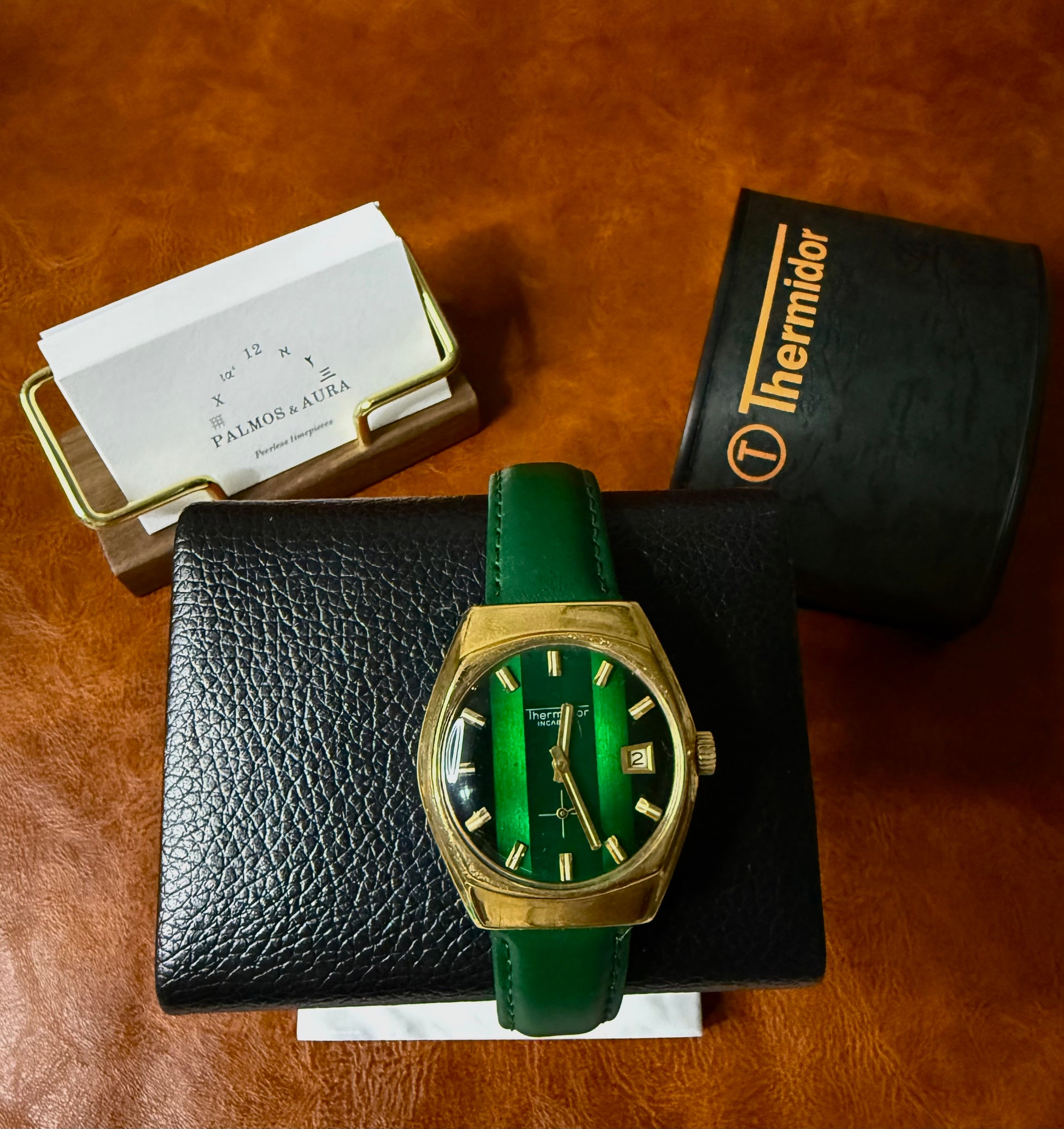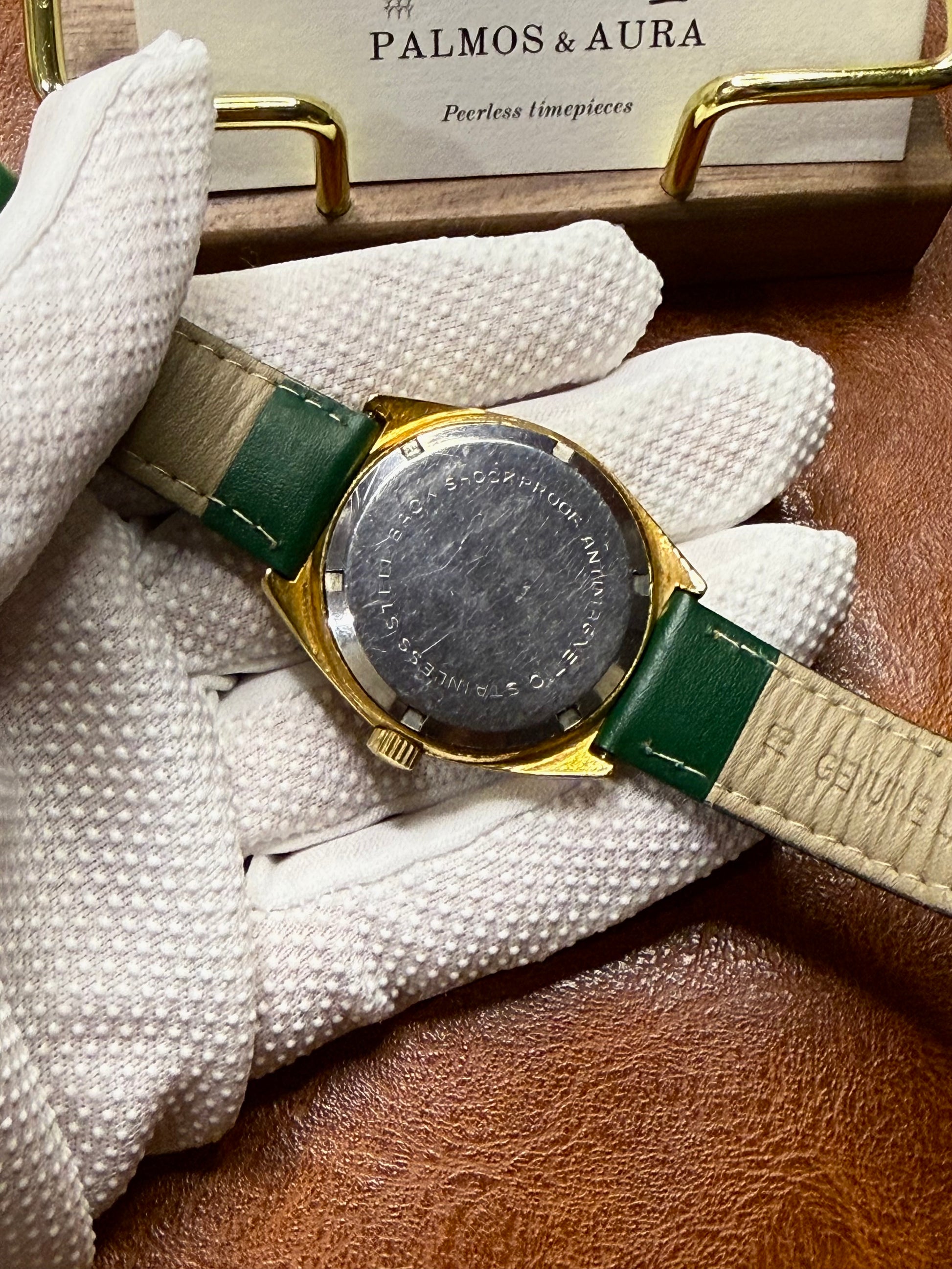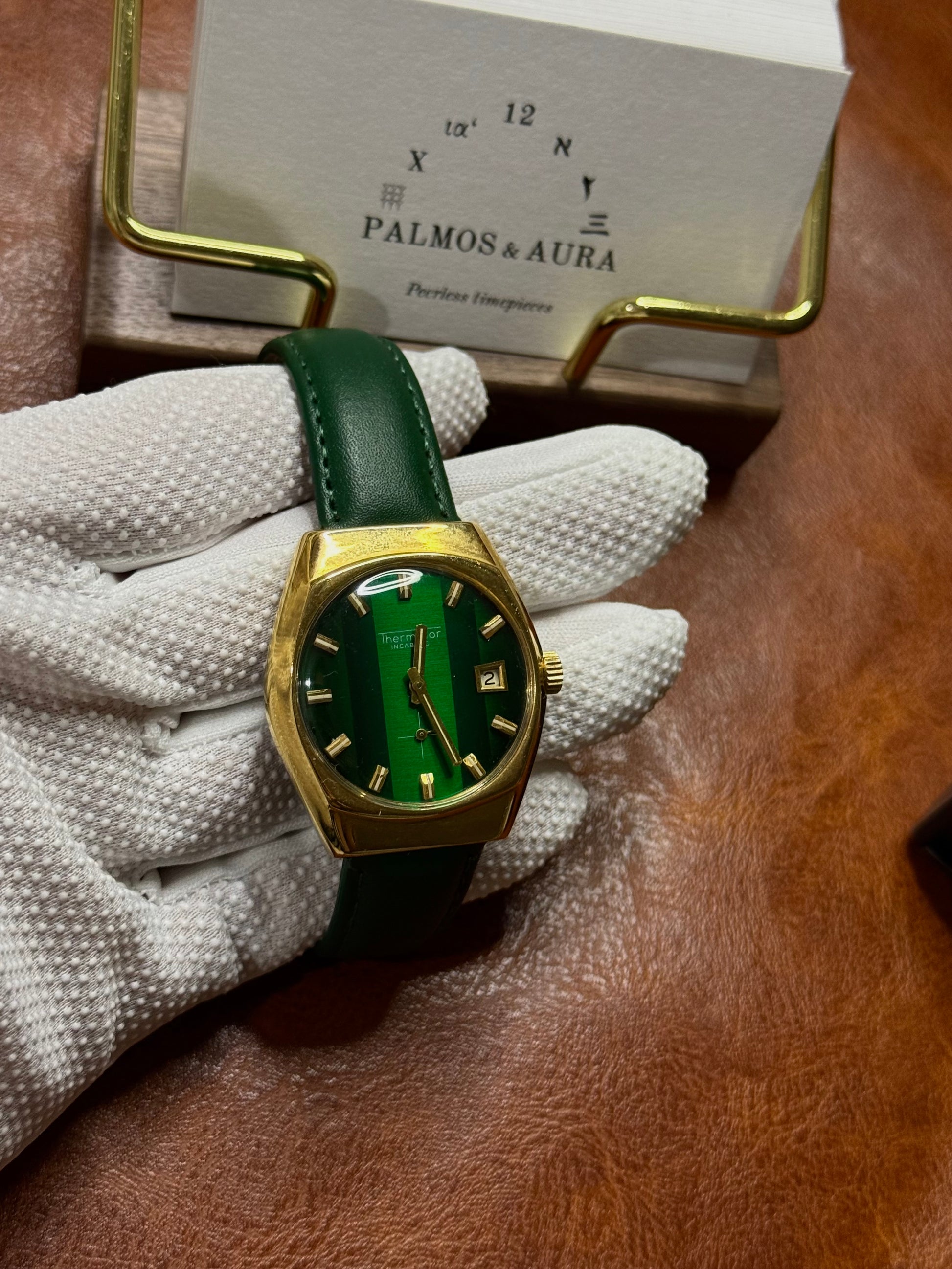 A unique green dial that you don’t come across very often — and the gold and green combination always stands out. Here at Palmos & Aura, we saw the potential in this Thermidor green dial watch and upgraded it by gold-plating the bezel with 18k yellow gold. The watch is now ready to change wrists—perhaps for the very last time.