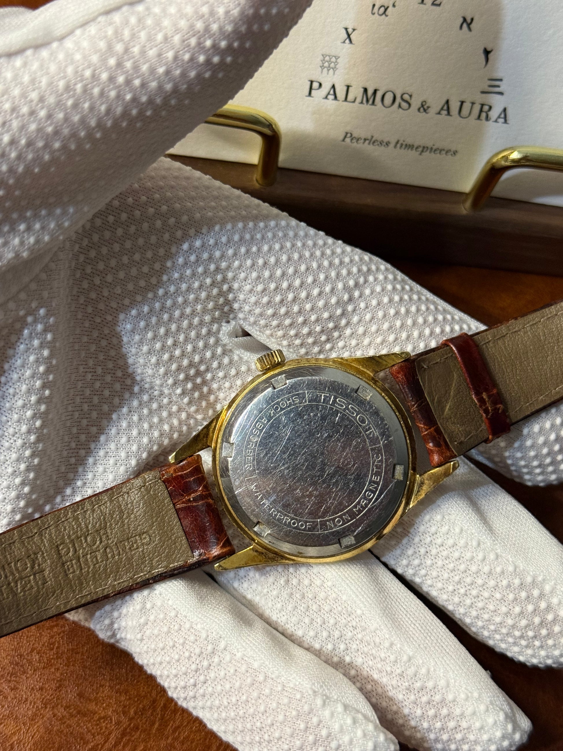 The Visodate line was introduced in the 1950s to commemorate Tissot’s centenary, merging classic design with an innovative automatic date mechanism. It continued into the 1970s with a touch of modernist flair. This Tissot Visodate dates back to 1955 and features an 18k yellow gold-plated case with a classic champagne-colored dial. It’s in great condition given its age and is looking for its next owner