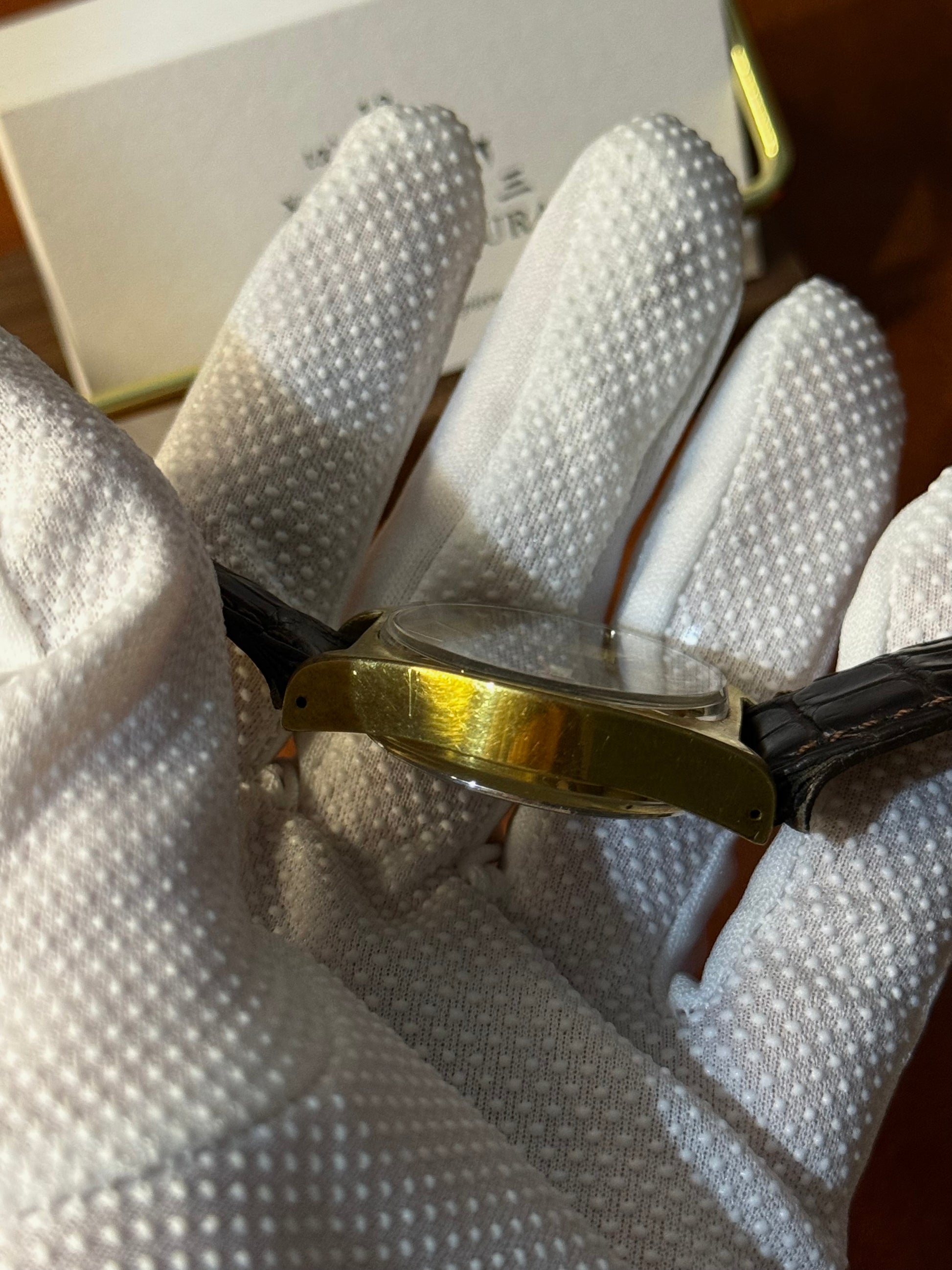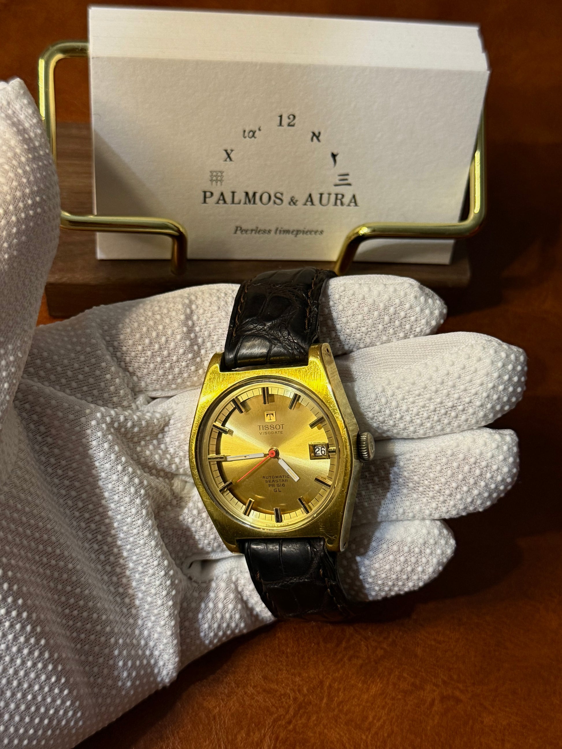The Visodate line was introduced in the 1950s to commemorate Tissot’s centenary, merging classic design with innovative automatic date mechanisms. It continued into the 1970s with a modernist flair. This Tissot Visodate PR 516 GL features an automatic mechanical movement and an 18k yellow gold case and dial. The warm gold-tone case is vintage without being flashy, refined without being shy. The red second hand adds just the right touch of personality — bold, but not loud.